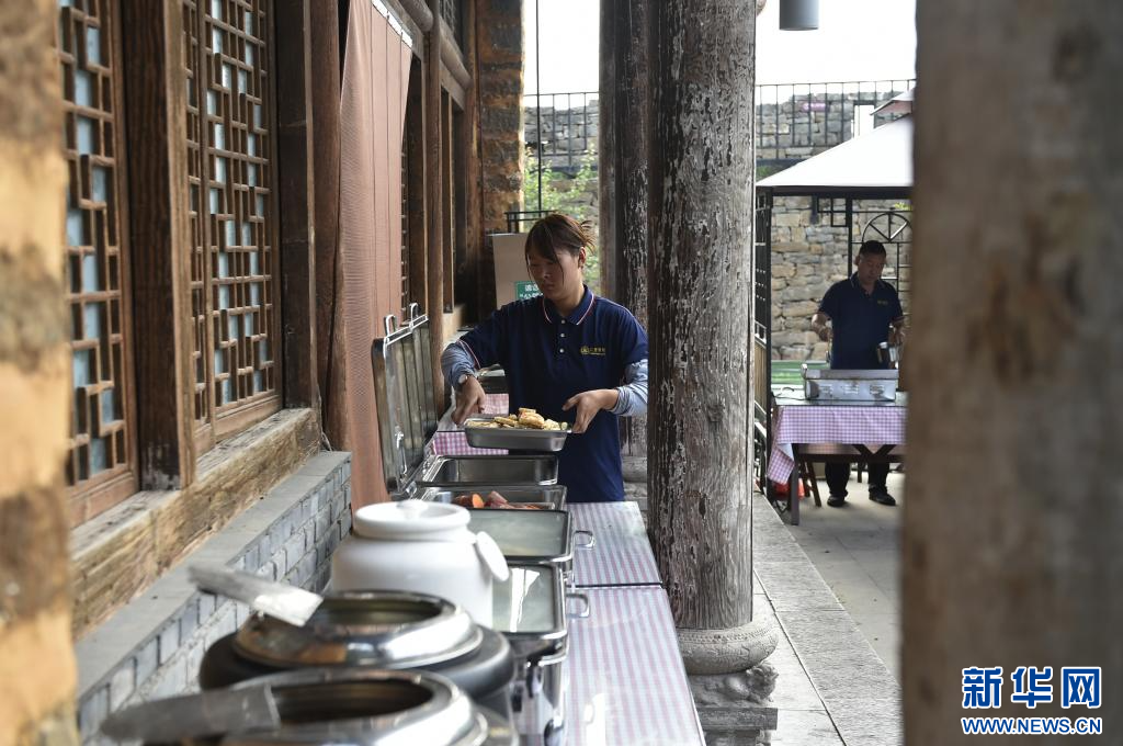 8月18日,在汝州市大峪镇袁窑村,云堡妙境民宿的工作人员为入住客人准备早餐。