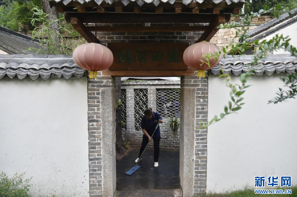 8月17日,在汝州市大峪镇袁窑村,云堡妙境民宿的工作人员在清洁地面。