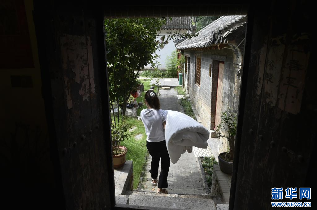 8月18日,汝州市陵头镇王湾民俗村的工作人员在整理民宿客房。