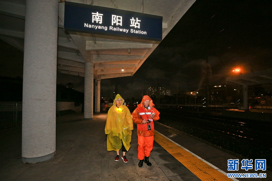 8月26日夜,南阳工务段铁路职工冒雨对线路进行徒步巡检,全面守护铁路安全。