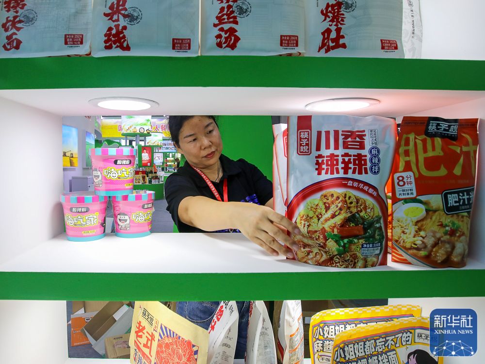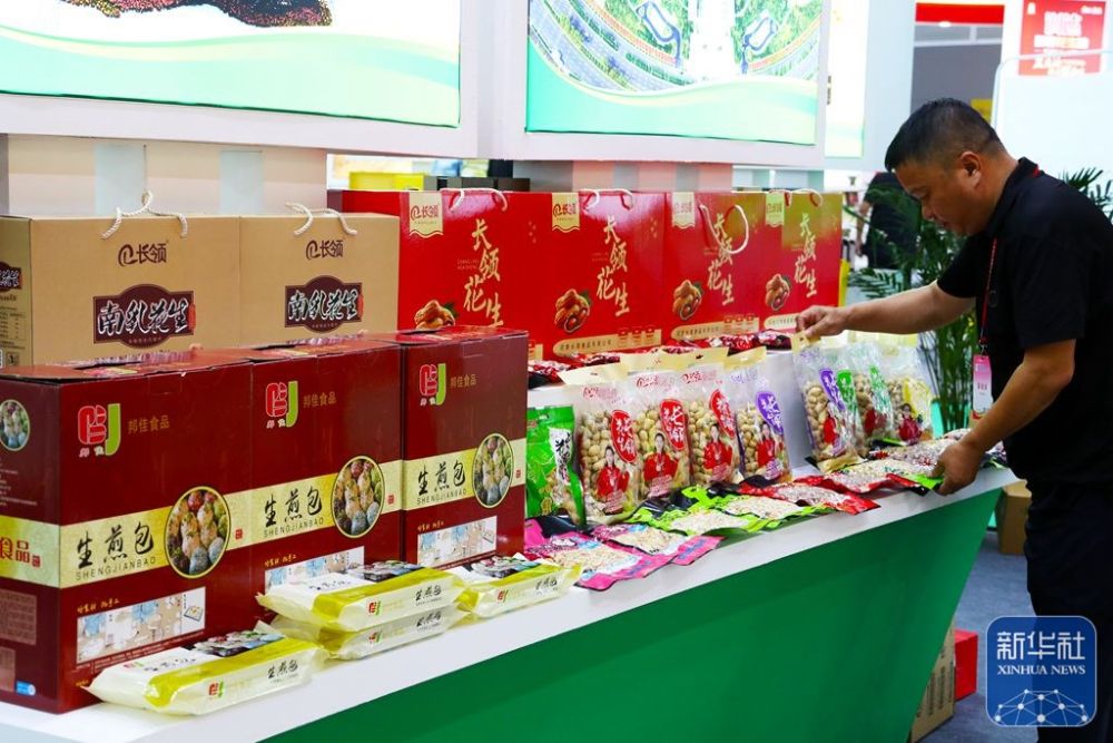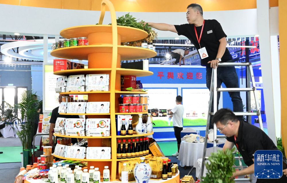 9月5日,工作人员在河南省农产品加工产品展区整理货品。麻翛然 摄