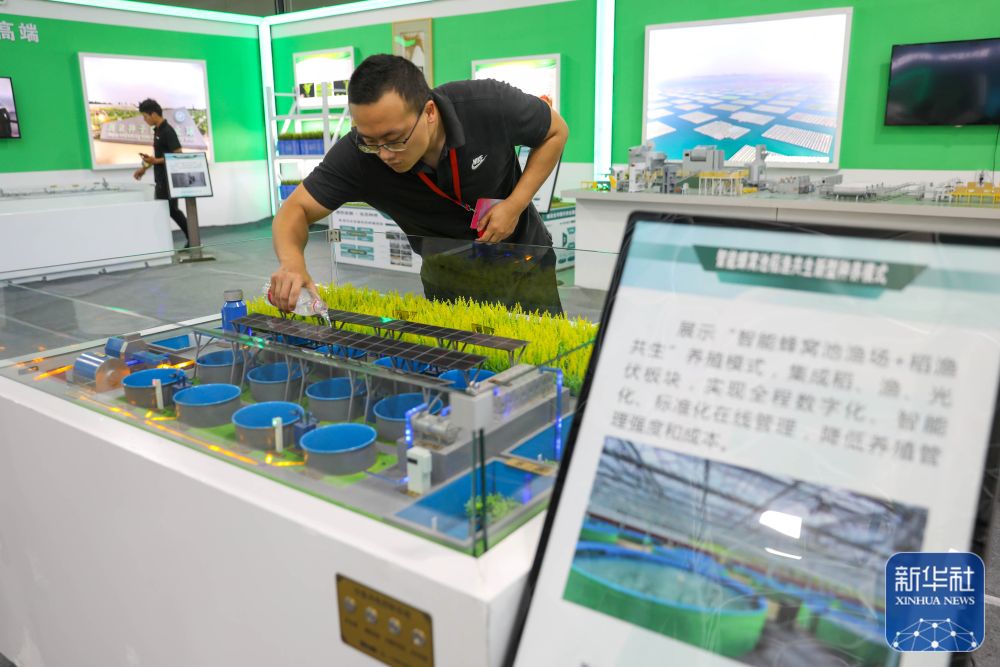 9月5日,工作人员在展区为“智能蜂窝池鱼场+稻渔共生”养殖模式模型灌水。何五昌 摄