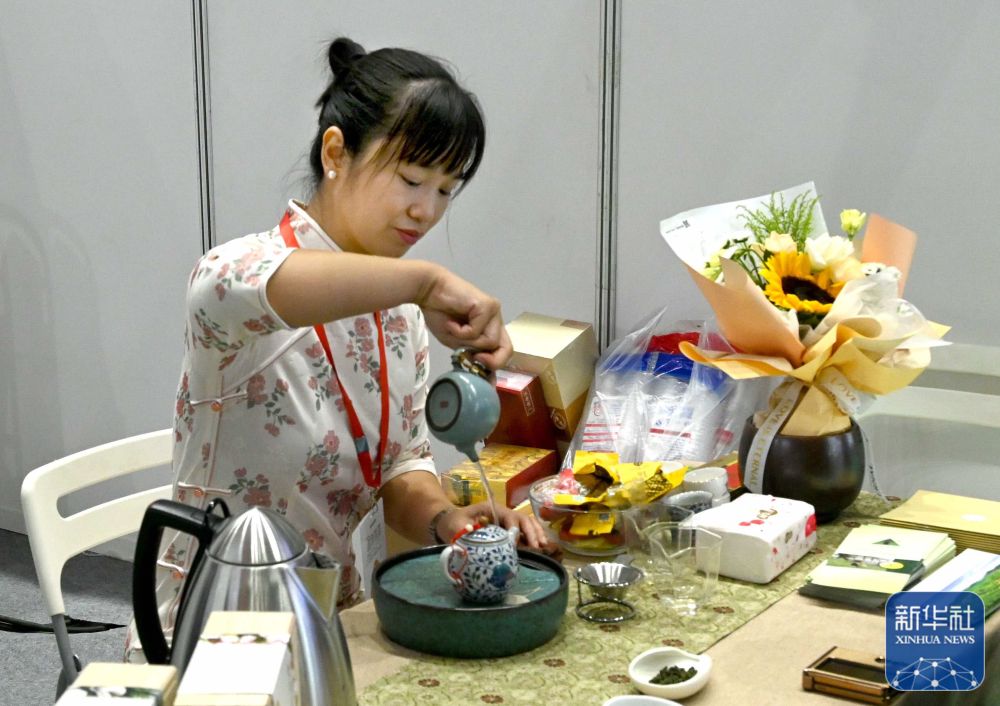 9月6日,在中国农加会脱贫地区和革命老区特色农产品展厅,福建省漳平市展区的工作人员在表演茶道。