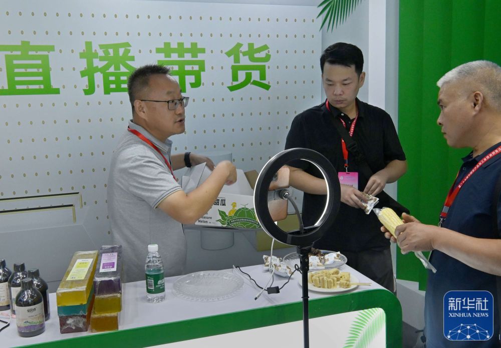 9月6日,在中国农加会脱贫地区和革命老区特色农产品展厅,工作人员在直播间推介农产品。