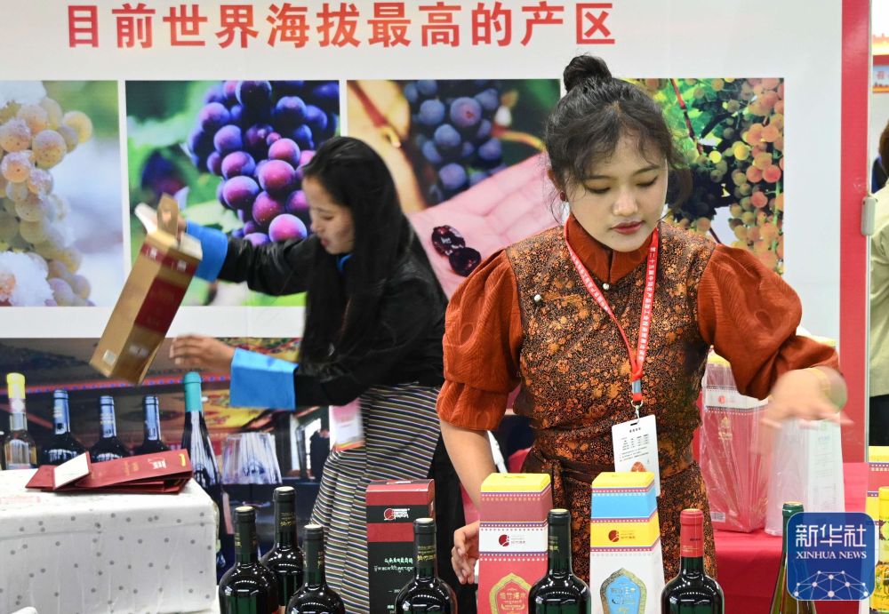 9月6日,在中国农加会脱贫地区和革命老区特色农产品展厅,西藏桑日县展区的工作人员在整理参展商品。