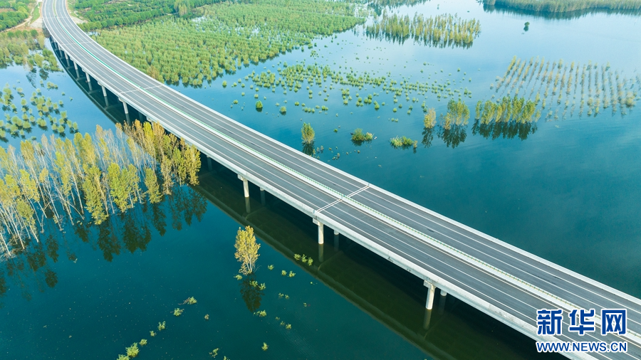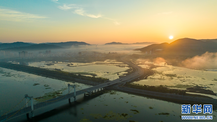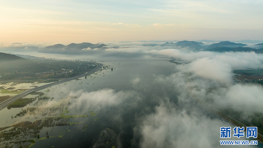近日,在河南省淅川县鹳河两岸,河水、绿树、山色浑然一体,大桥、公路、天空相映成趣,与雨后缥缈的云雾一起,勾勒出奇妙的山水画卷,宛若人间仙境。新华网发(徐迪 摄)