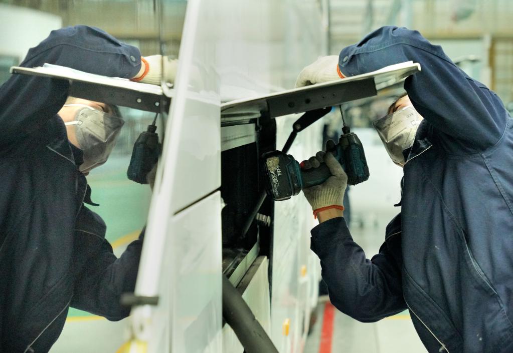 3月8日,工作人员在宇通新能源厂区高端及海外承装车间里作业 李安 / 摄