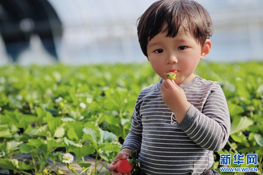 11月21日,小朋友正在品尝刚采摘的新鲜草莓。