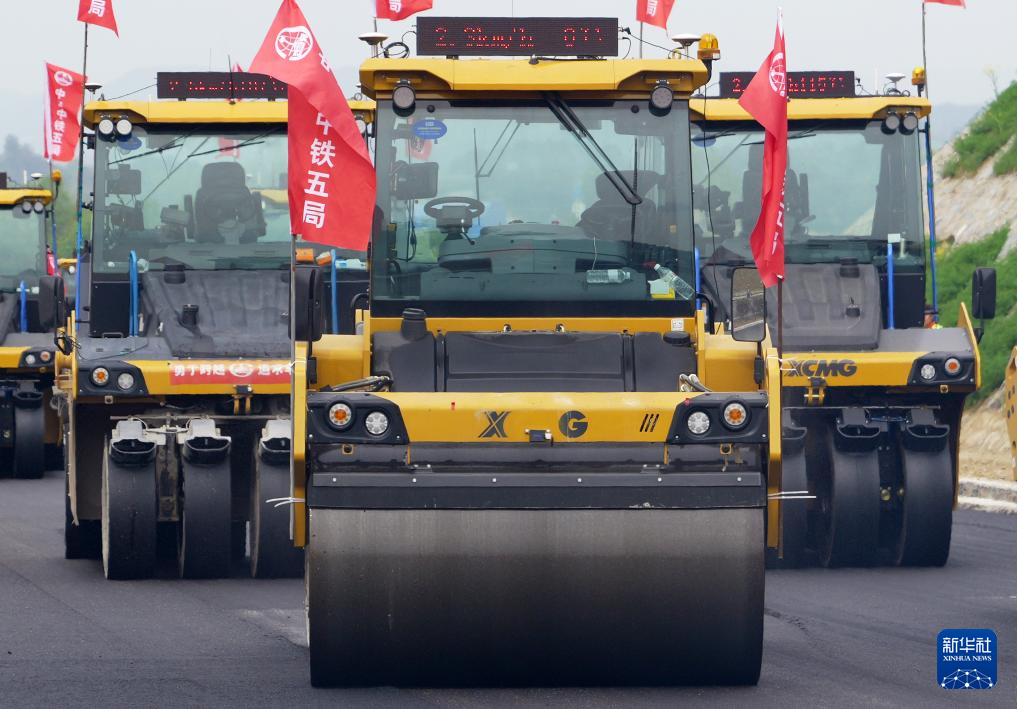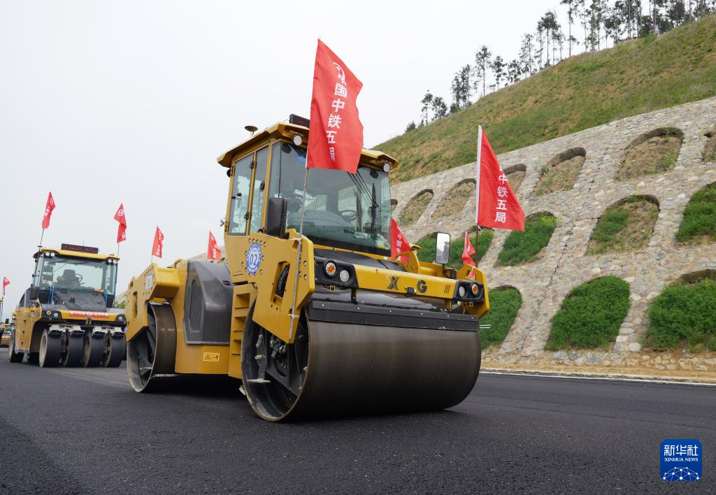当日,由中铁五局承建的沿大别山高速公路鸡公山至商城段JSSG-2标首次运用无人摊铺+北斗高精定位智能系统,完成全线首段路面中面层试验段铺筑。
