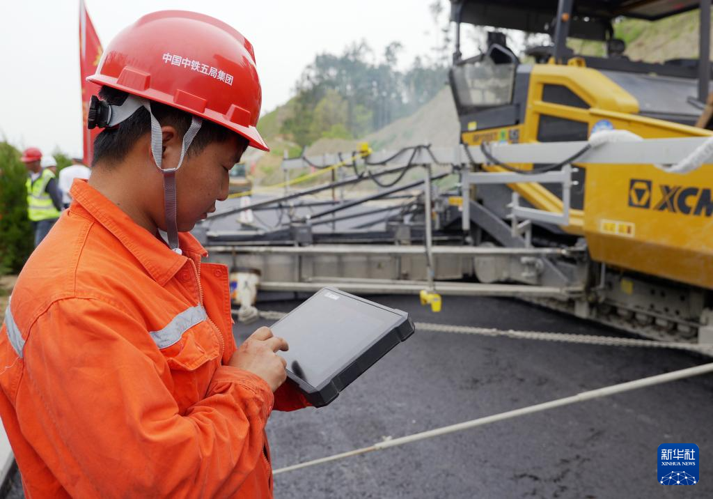 4月11日,中铁五局工作人员在调试无人驾驶摊铺机参数。新华社记者 李嘉南 摄
