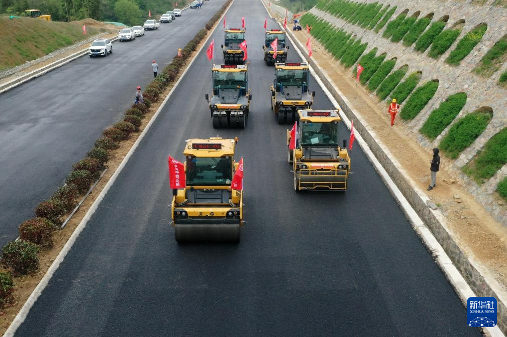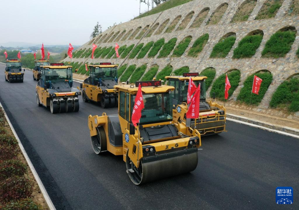 4月11日,无人驾驶压路机在作业中(无人机照片)。新华社记者 李嘉南 摄