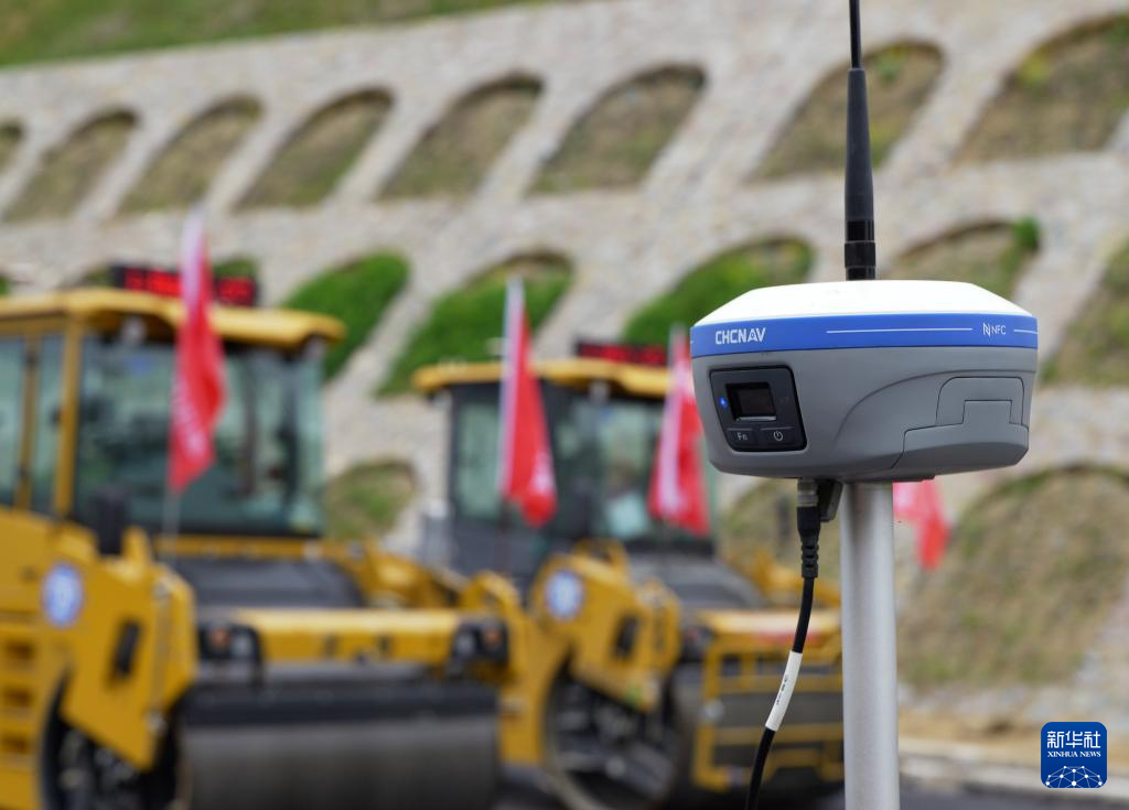 基准站在为作业中的无人驾驶压路机提供定位坐标(4月11日摄)。新华社记者 李嘉南 摄