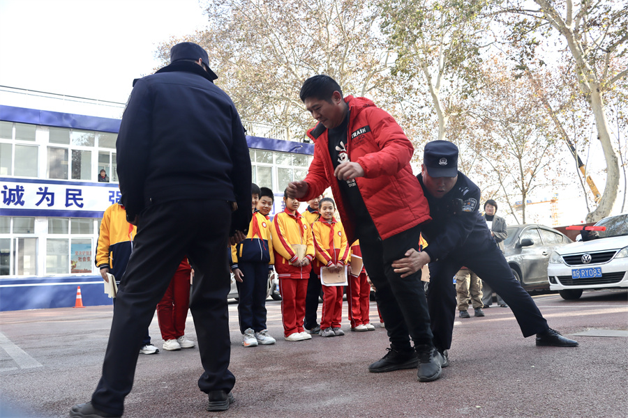 1月8日,在南阳市公安局宛城区公安分局东关派出所,民警向孩子们演示擒拿技巧。