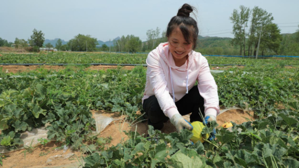 图为驿城区蚁蜂镇鲁湾村春兴种植农民专业合作社工作人员正在采摘冰糖蜜甜瓜。