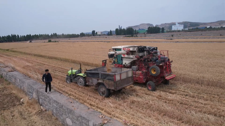 眼下,豫北地区的小麦逐渐进入成熟收获期。在河南省卫辉市唐庄镇丘陵地区的麦田中,金浪翻滚,麦香四溢,当地农户正抢抓晴好天气收割小麦。这块田是丘陵坡地的再造田,由于之前土层薄、有机质差、漏水漏肥,小麦产量低。