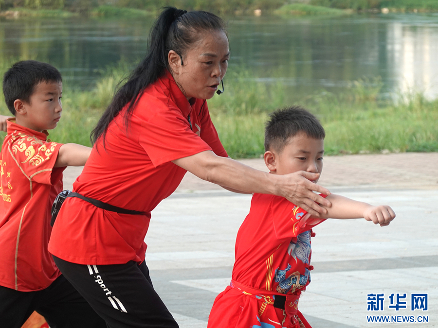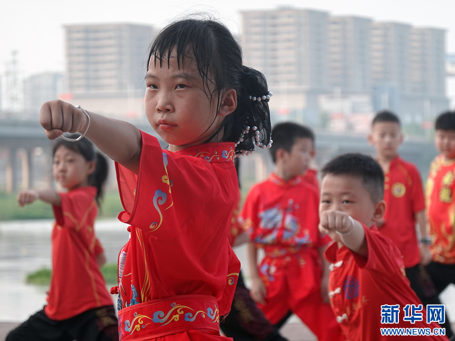 7月16日,在南阳市宛城区仲景街道,孩子们正在学习武术动作。
