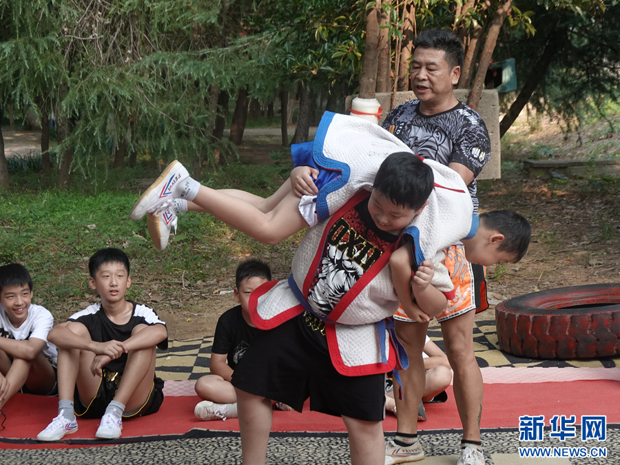 7月16日,在南阳市宛城区仲景街道,孩子们正在学习传统摔跤。