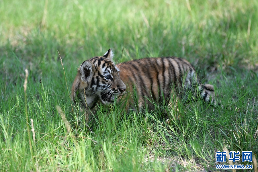 7月29日,在河南省沁阳市和生森林动物乐园老虎散养区拍摄的小东北虎。