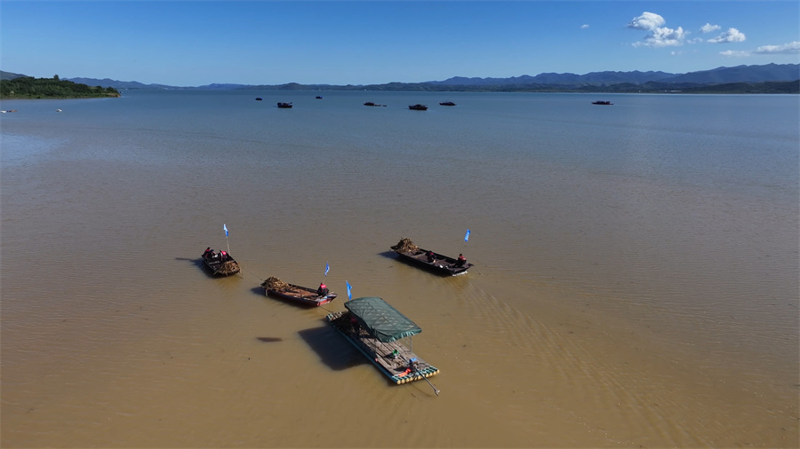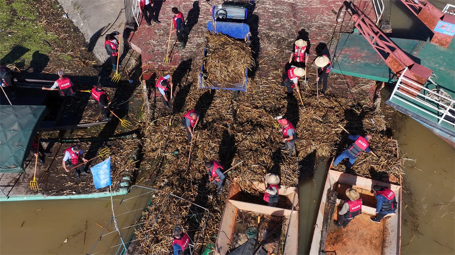 在清漂过程中,那些看似轻飘飘的水草,因为吸满了水,变得很重,清漂起来并不容易。清漂队员们从早上8点左右开始,除了简单的午餐时间,大部分时间都在清理漂浮物,一天下来往往腰酸腿疼、双臂麻木,但他们任劳任怨,牢记作为清漂人的宗旨,做到“不设盲区、不留死角、有漂即捞”。(康帆)