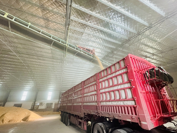 10月10日,在河南省洛阳市伊川县聚和农业开发有限公司,烘干后的玉米正在装车运输。(国网洛阳供电公司供图)