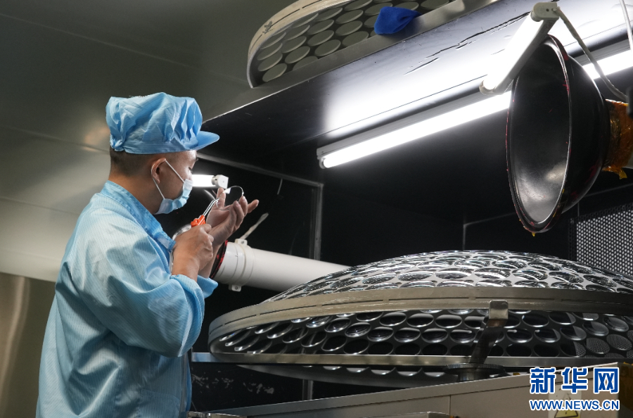 图为工人在为镜片镀膜。