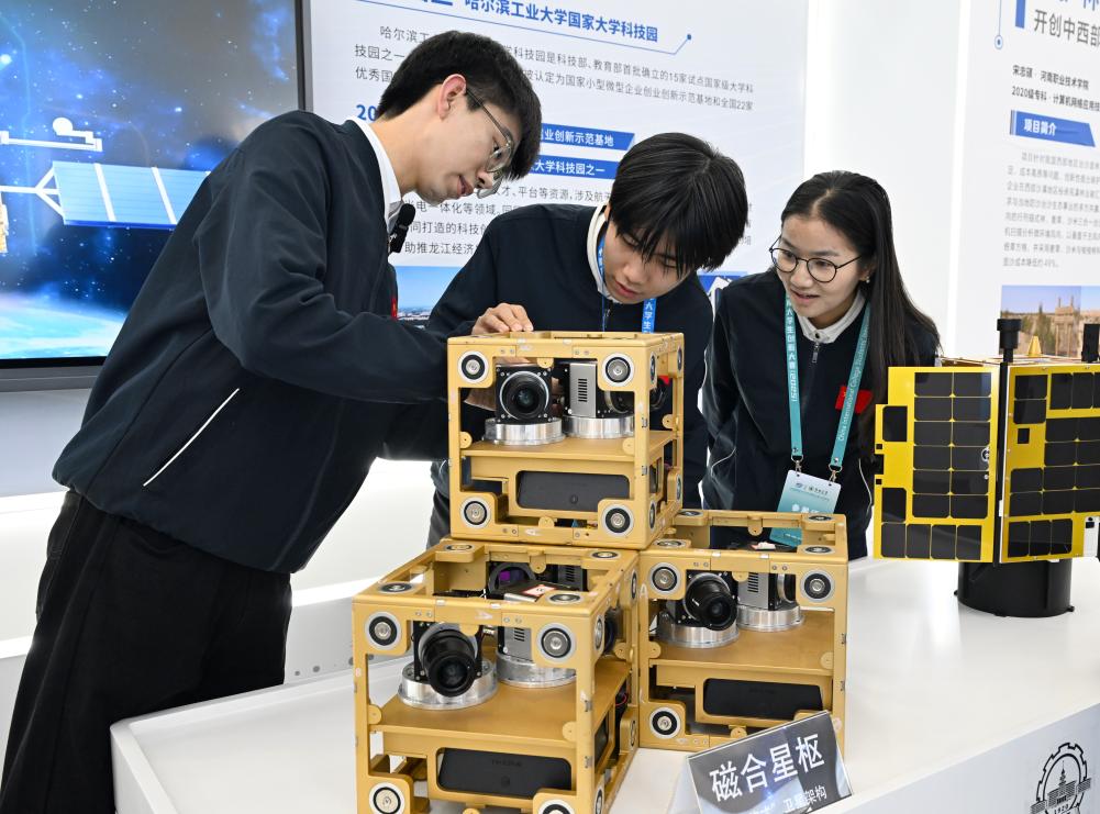 10月14日,在大学生创新成果展现场,哈尔滨工业大学代表在展示“磁合星枢——面向巨星座建设的新体制‘细胞’卫星平台”项目模型。