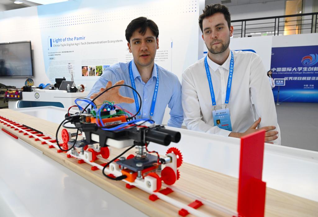 10月14日,在大学生创新成果展现场,奥克兰大学代表在介绍“轨智智能——基于人工智能的下一代铁路轨道结构状态监测系统”项目模型。