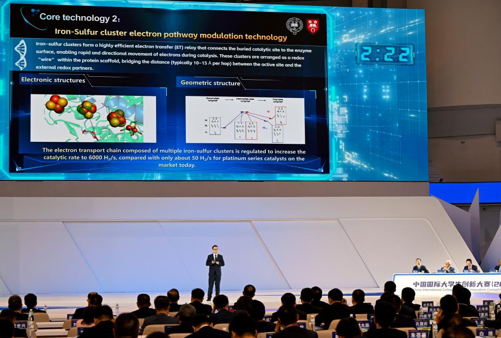 10月15日,在冠军争夺赛现场,牛津大学的“酶激增”项目参赛者在进行展示。