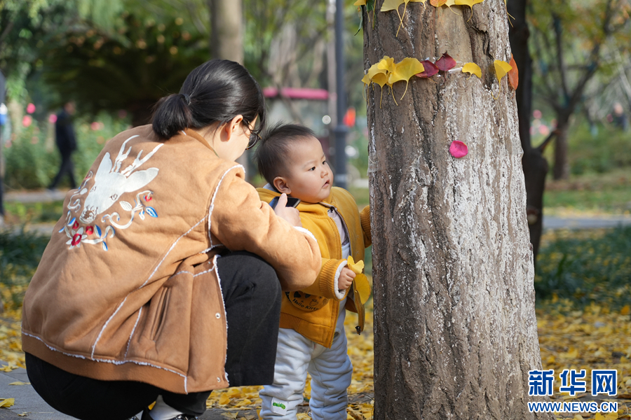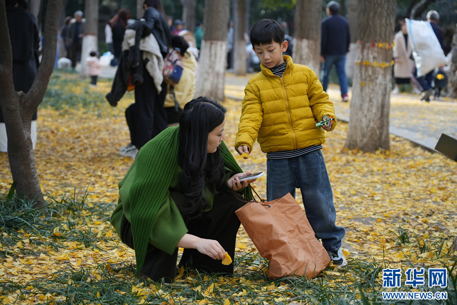 11月11日,南阳人民公园内,市民带着孩子在银杏树下游玩。