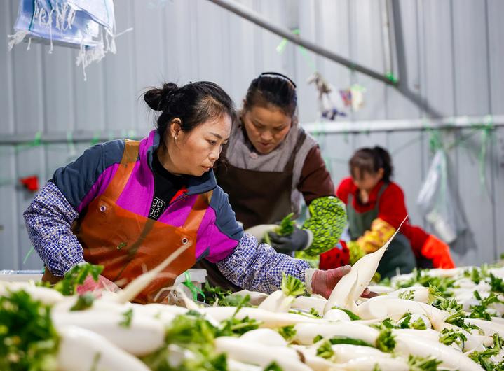 11月12日,在河南省安阳市内黄县马上乡大黄滩村,工人们正在将刚刚采收的白萝卜分拣装箱。