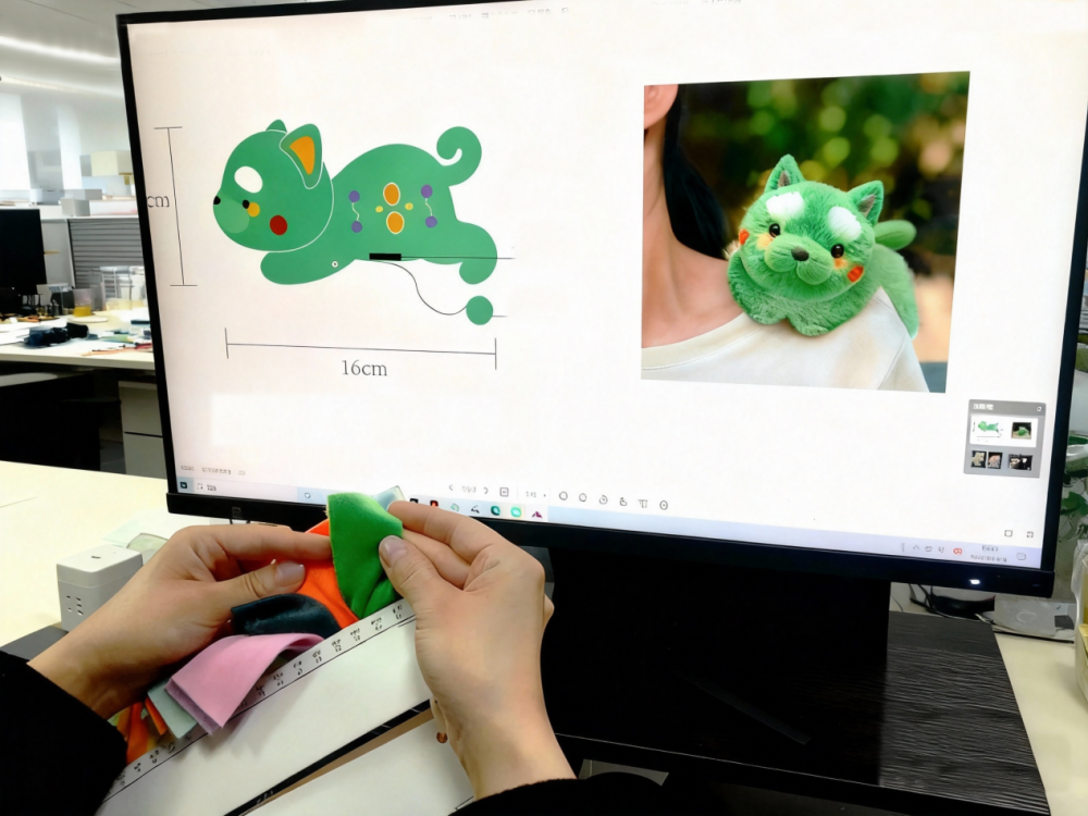 深绿、浅绿、粉、白、黑五种色彩的毛绒玩偶