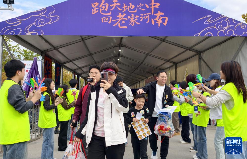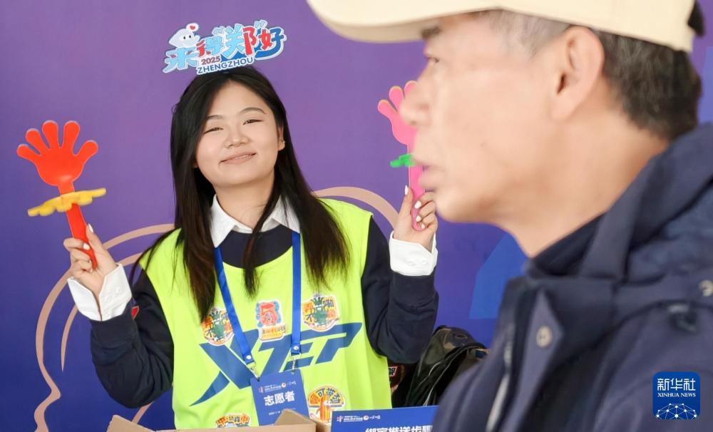 11月15日,志愿者在2025郑州马拉松签到处欢迎马拉松选手。高山岳 摄
