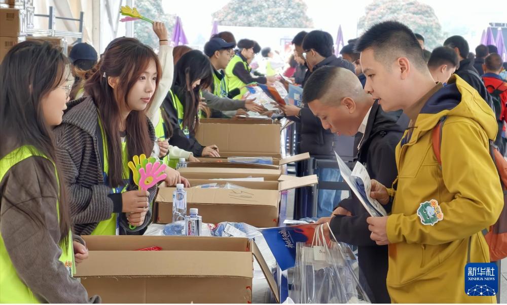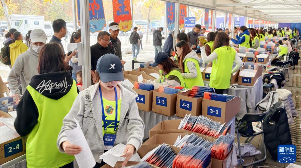11月15日,志愿者在2025郑州马拉松签到处给马拉松选手发放物品。高山岳 摄