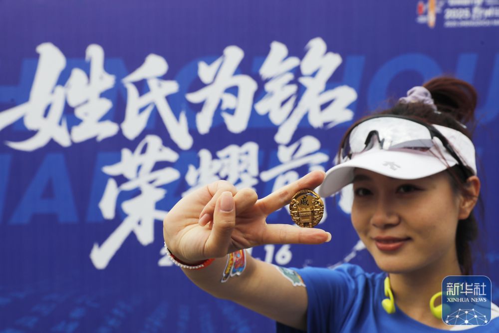 11月15日,来自昆明的马拉松参赛选手戚睿丹展示自己的姓氏徽章。冯小敏 摄