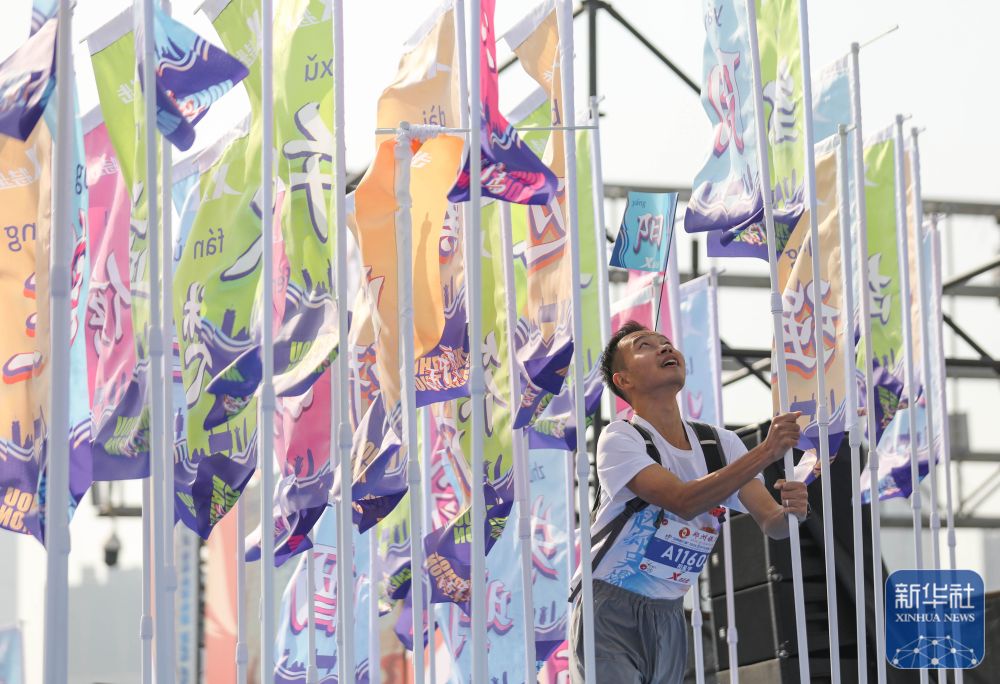 11月16日,一位“姓氏旗手”正在参加2025郑州马拉松赛后的插旗活动。何五昌 摄