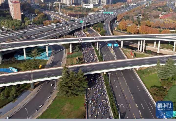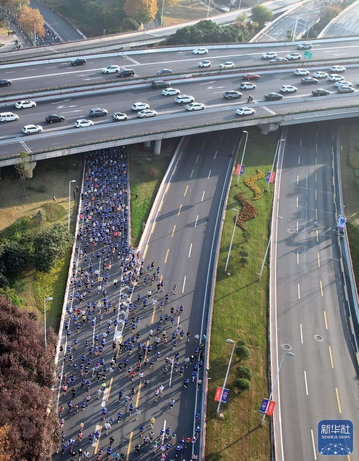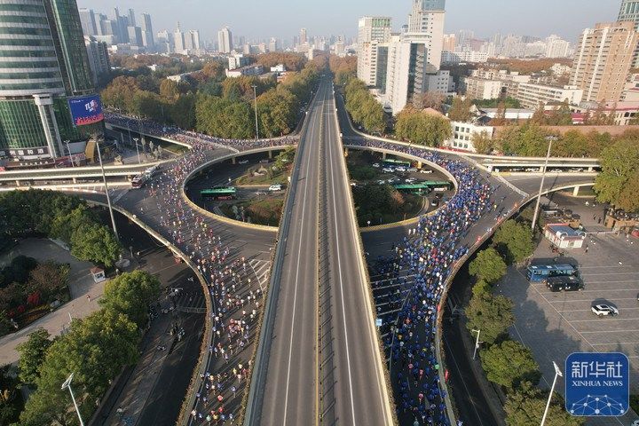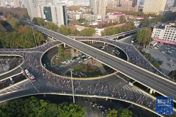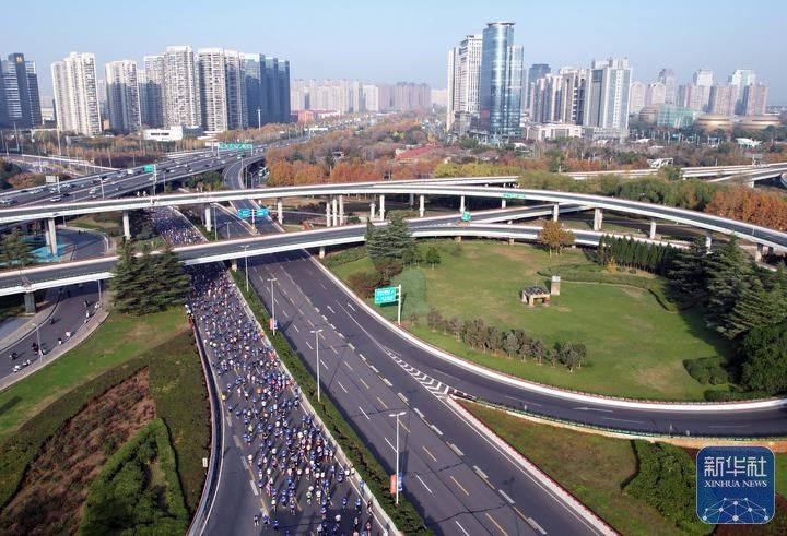 11月16日,2025郑州马拉松参赛选手奔跑在郑州市紫荆山立交桥上(无人机照片)。李新华 摄