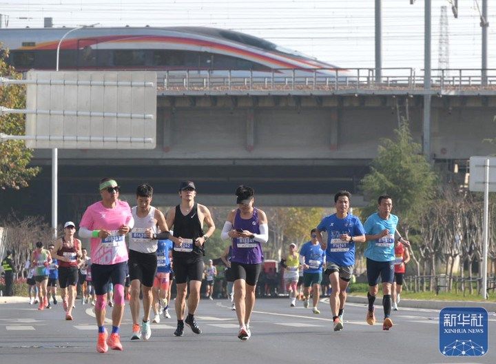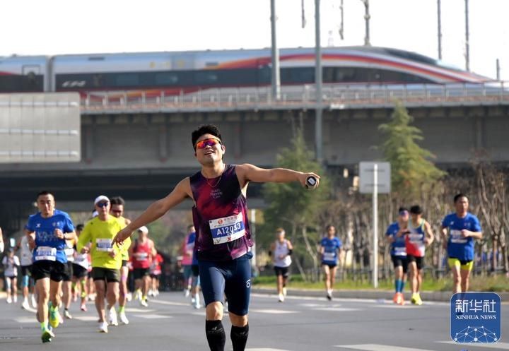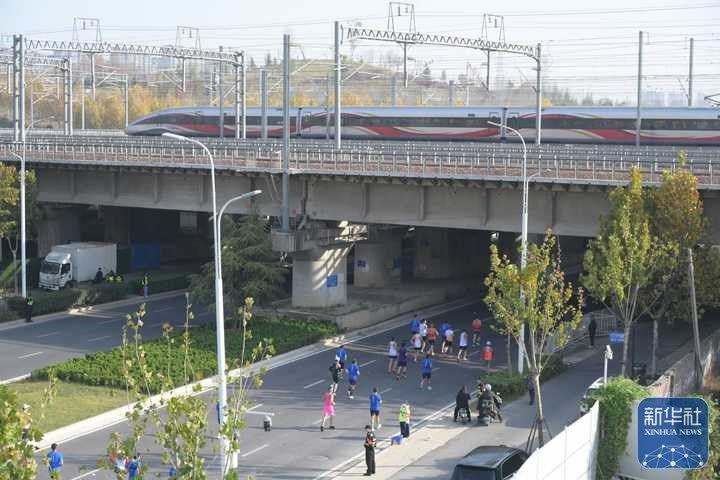 11月16日,2025郑州马拉松参赛选手与高铁同框。祁连山 摄
