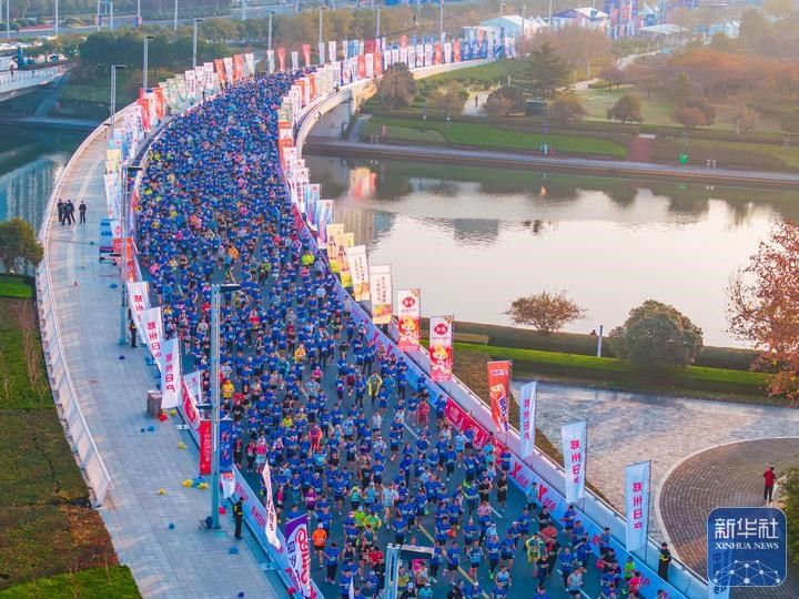 11月16日,2025郑州马拉松参赛选手奔跑在郑州市如意湖畔(无人机照片)。谷雨 摄