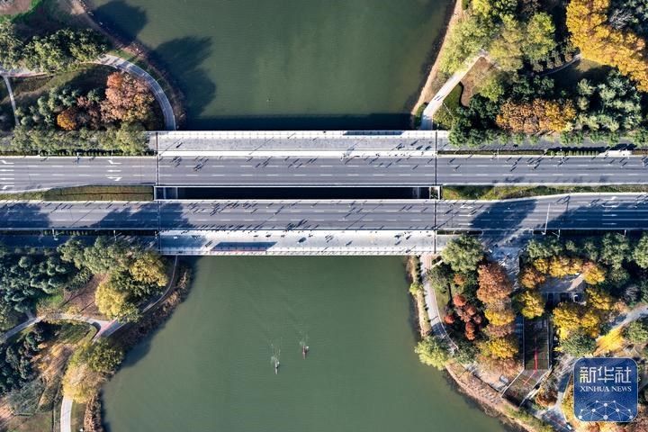11月16日,2025郑州马拉松参赛选手从桥上跑过如意湖(无人机照片)。谷雨 摄