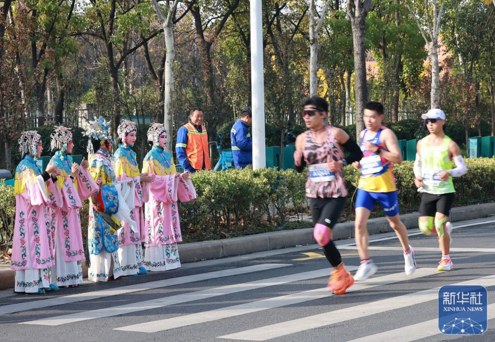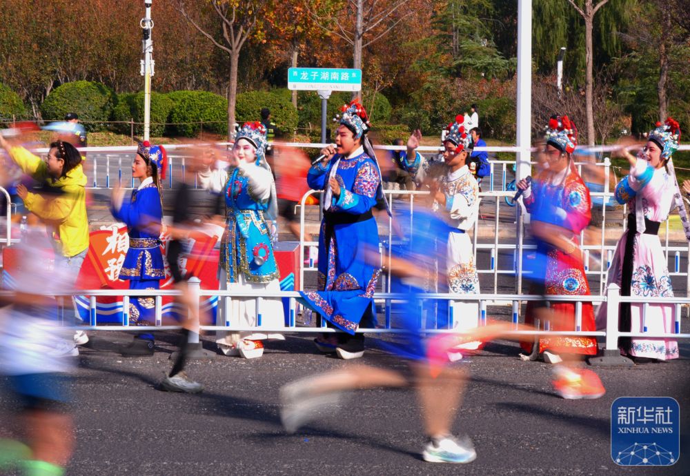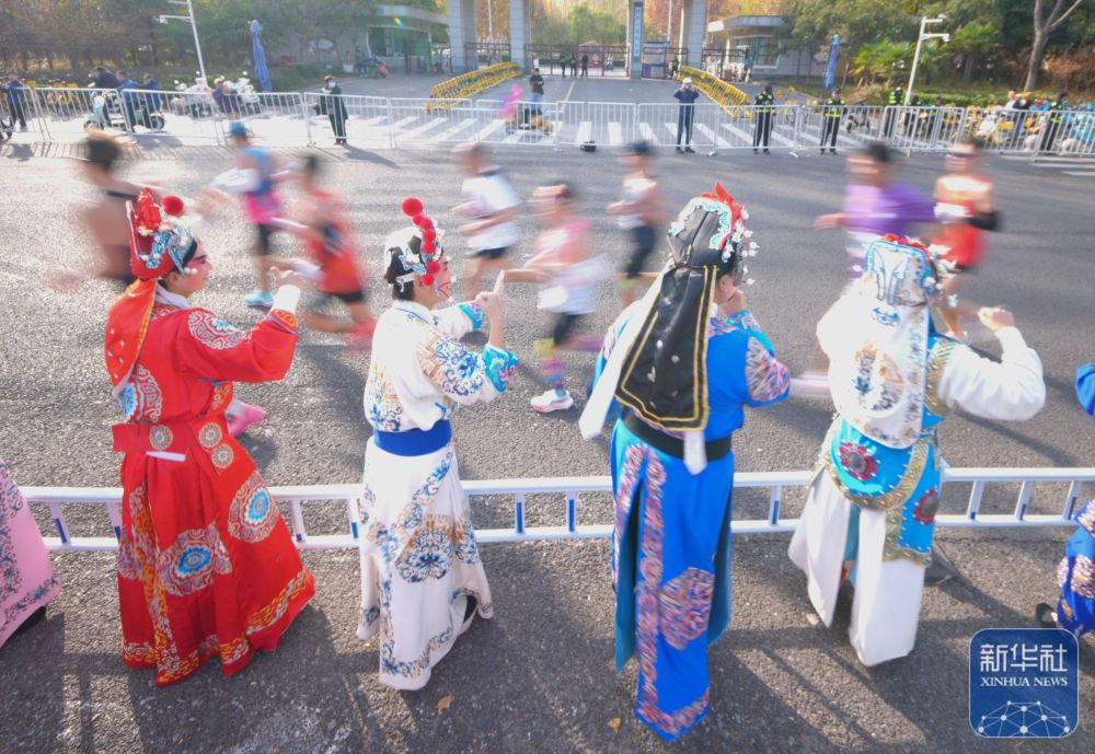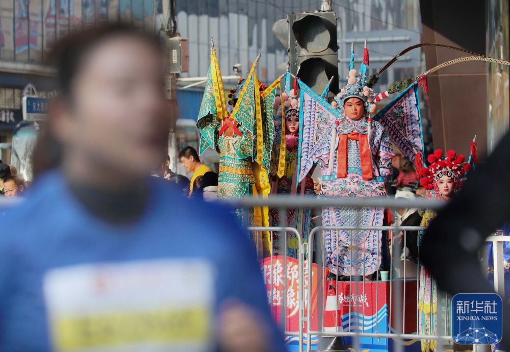11月16日,豫剧演员为郑州马拉松参赛选手加油助威。徐宏星 摄