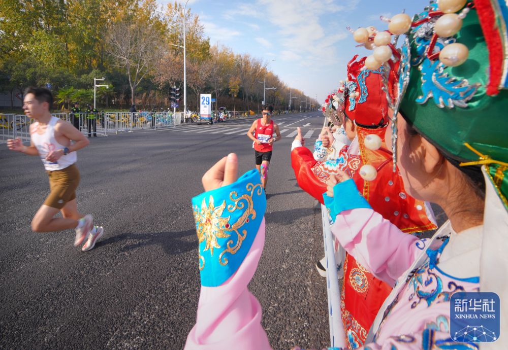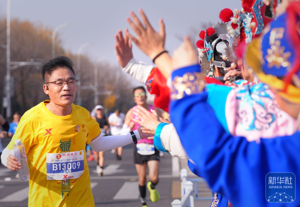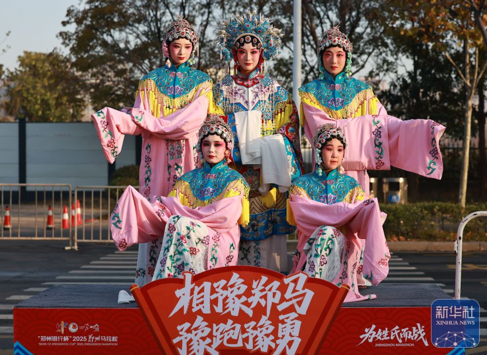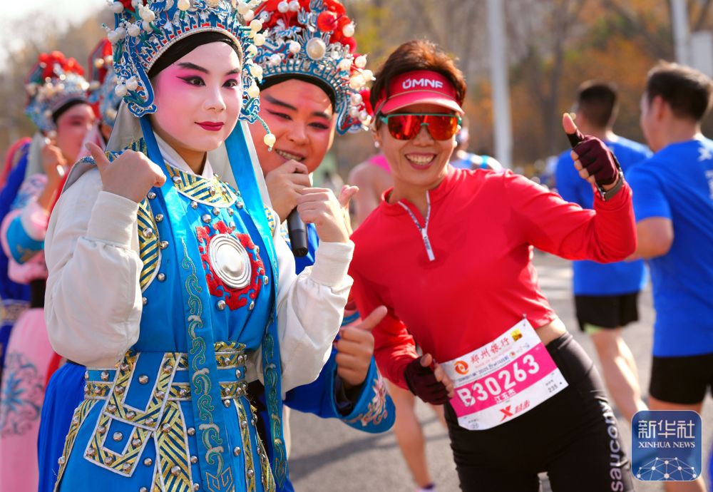 11月16日,豫剧演员为郑州马拉松参赛选手加油助威。张一硕 摄