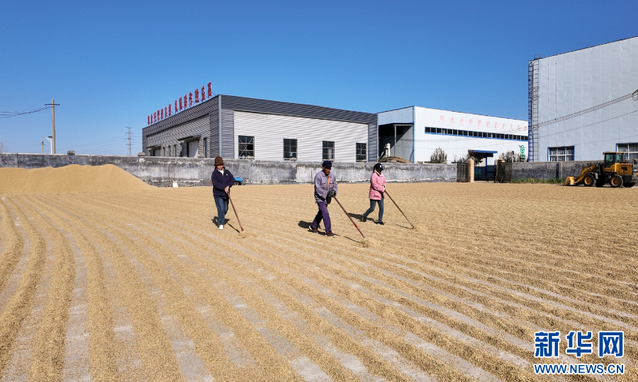 11月18日,在濮阳市范县杨集乡,工人们正在翻晒新收的稻谷。李博 摄