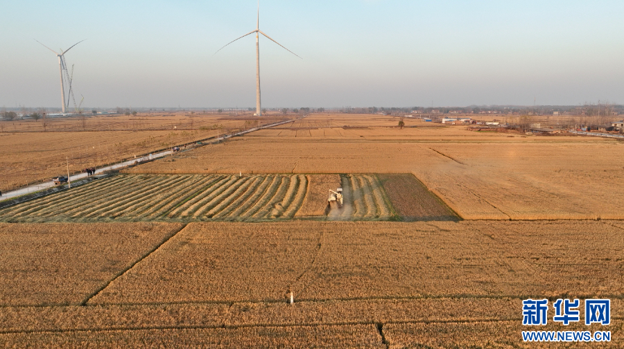 11月20日,收割机在濮阳市范县辛庄镇的稻田里收获稻谷(无人机照片)。李博 摄