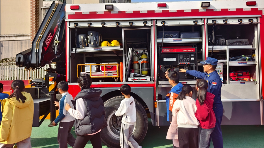 11月15日,在鹤壁市淇滨区,鹤壁市湘江小学的学生们在消防员的陪同下参观消防车。(张磊 摄)
