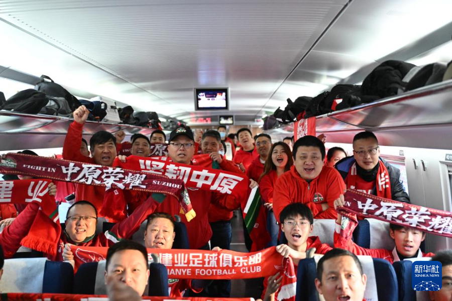 12月6日,河南俱乐部酒祖杜康队球迷在G1801次列车上为球队加油助威。