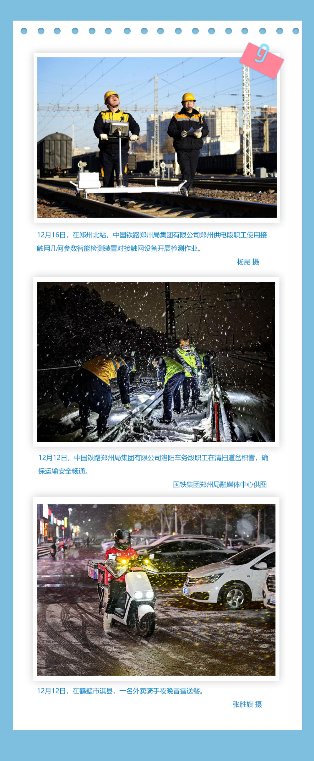铁路职工检测接触网,挥帚清扫道岔积雪