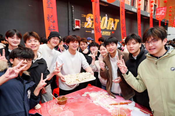 12月19日,郑州城市职业学院冬至饺子节活动现场,学生合影留念。(周志远 摄)