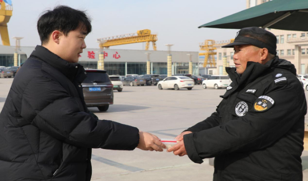 12月21日,大方控股集团有限公司员工为值班保安送去饺子。(韩晴 摄)