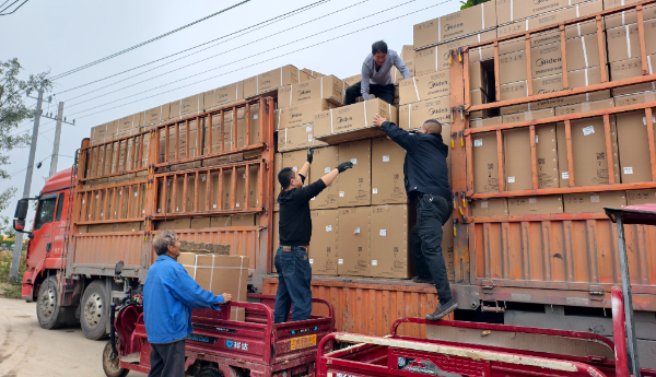 在平顶山市叶县仙台镇黄李村,安装工人正在搬卸暖风机。通联照片 受访人供图