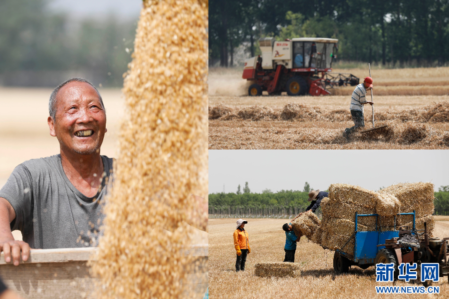 河南省宝丰县村民在收获小麦、打捆秸秆(拼版照片)。